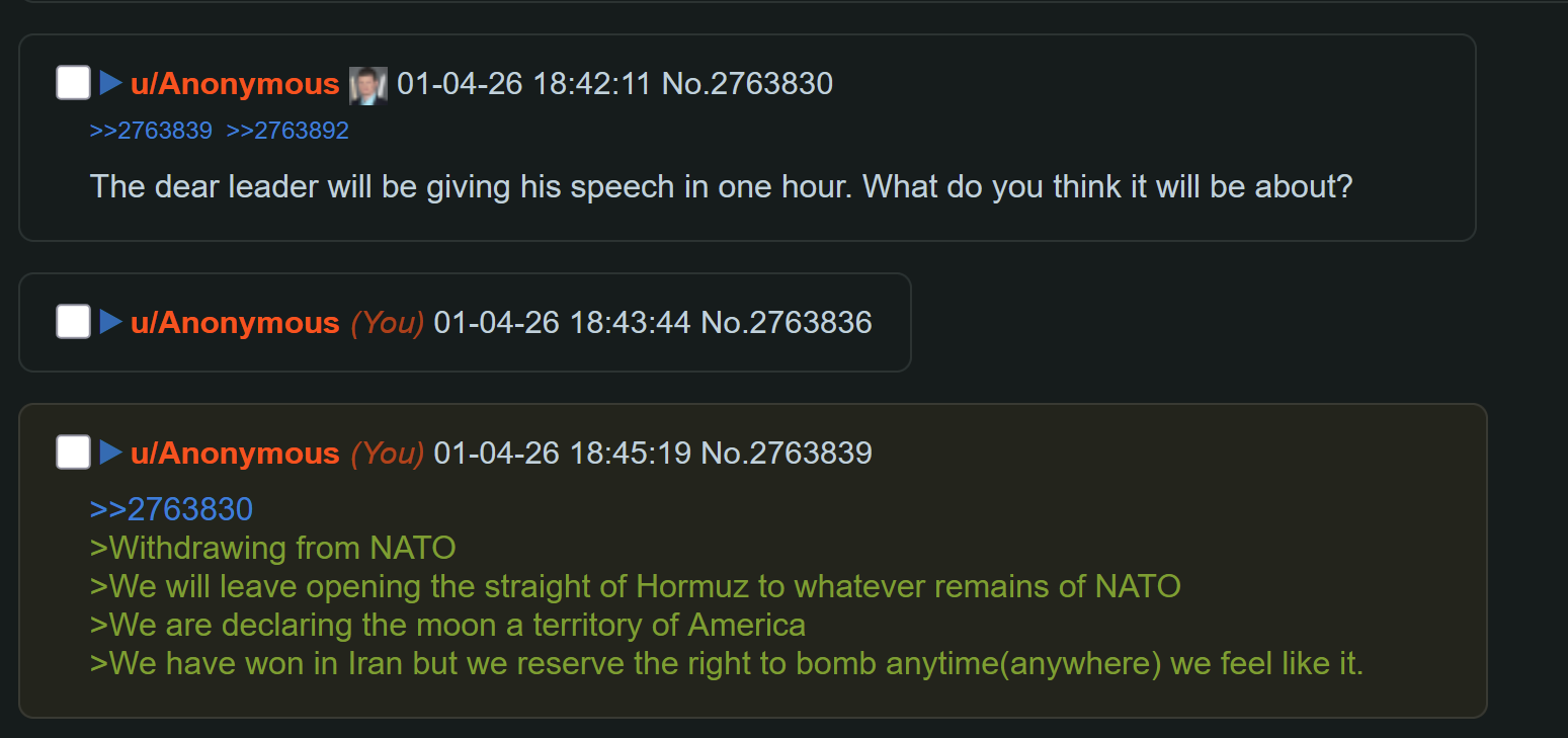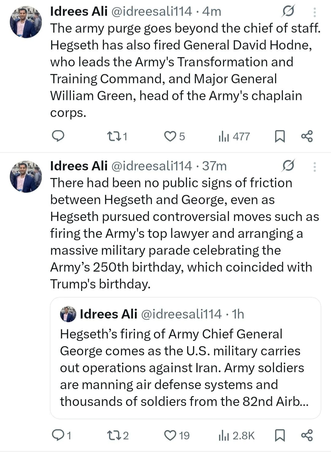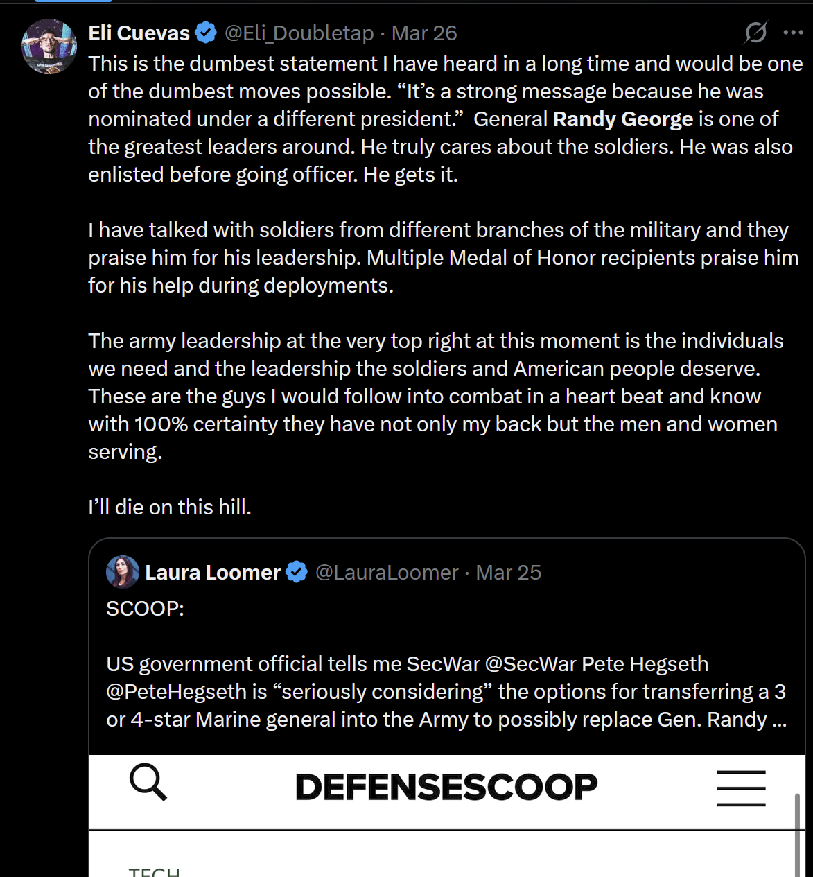 >>2765258>>2765259I kind of wonder what the point of this purge right now is? Like if I had to guess maybe they told Hegseth that a ground invasion of Iran is infeasible and Pete figured they were woke pussies afraid of a few people dying? Thats my best guess.