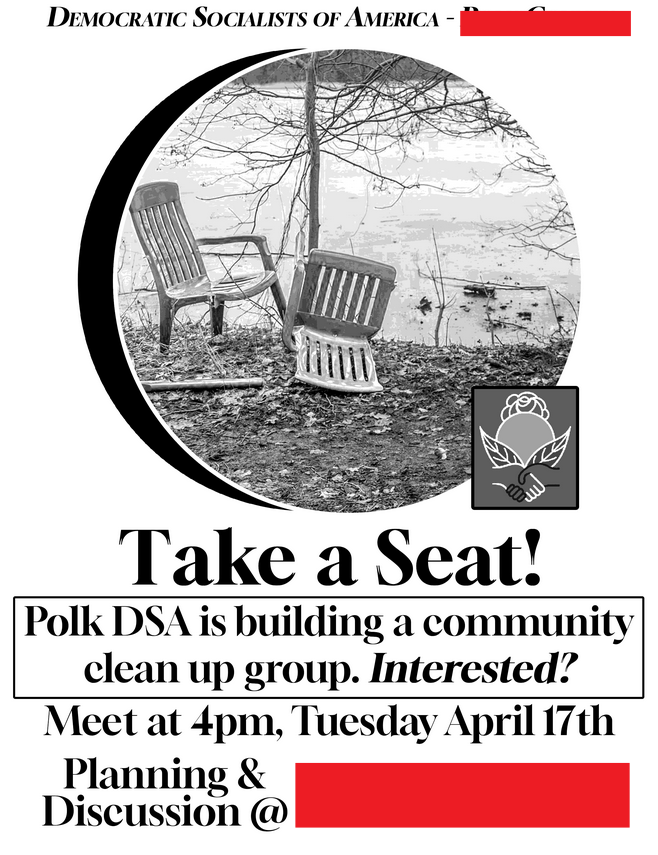 couple of angles I'd think are decent: connection to the land, corporations produce the litter ('litter as advertising'), the need for more jobs programs that entail keeping these spaces clean, while also using the optics to really hammer in the DSA as a local caretaker, people who care deeply inspire others to care deeply which creates a mandate which can be used to advance other means later (ie electoral ends). would be strong material for the social media and recruitment. both photos of us doing the cleaning, the trash gathered, as well as more nature shots and natural landscapes in general, since ultimate one of our biggest enemies is the developer/land owner class