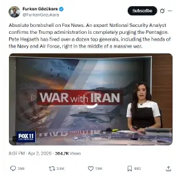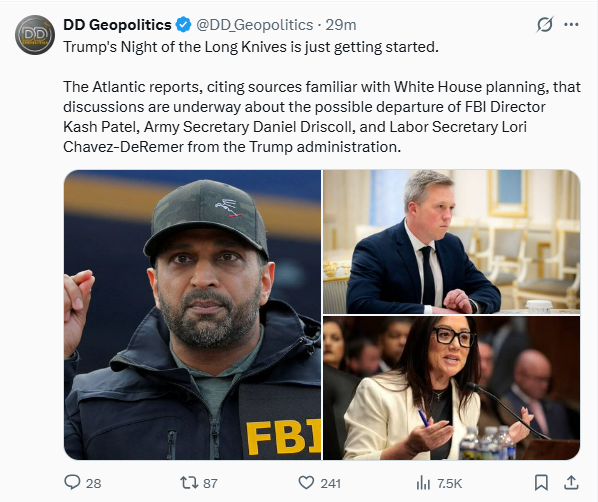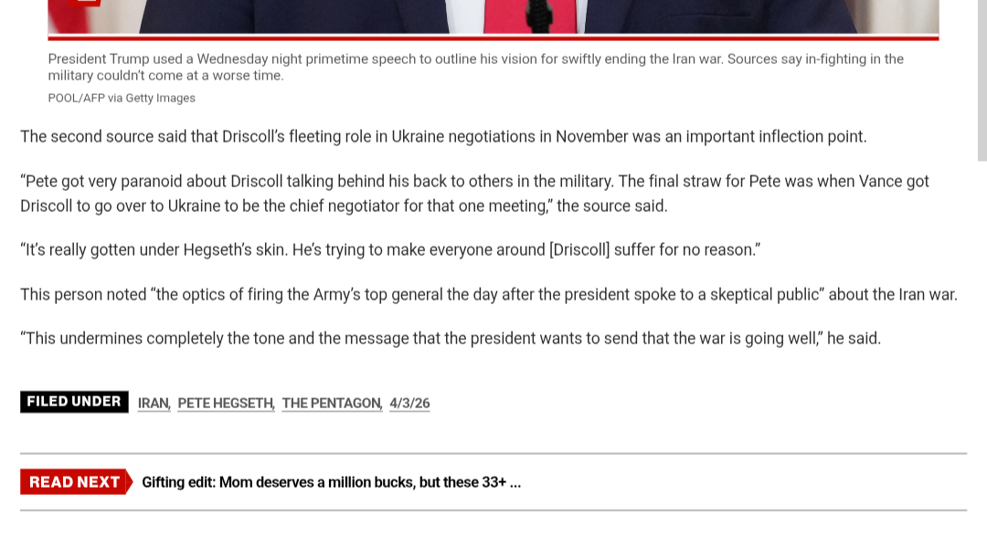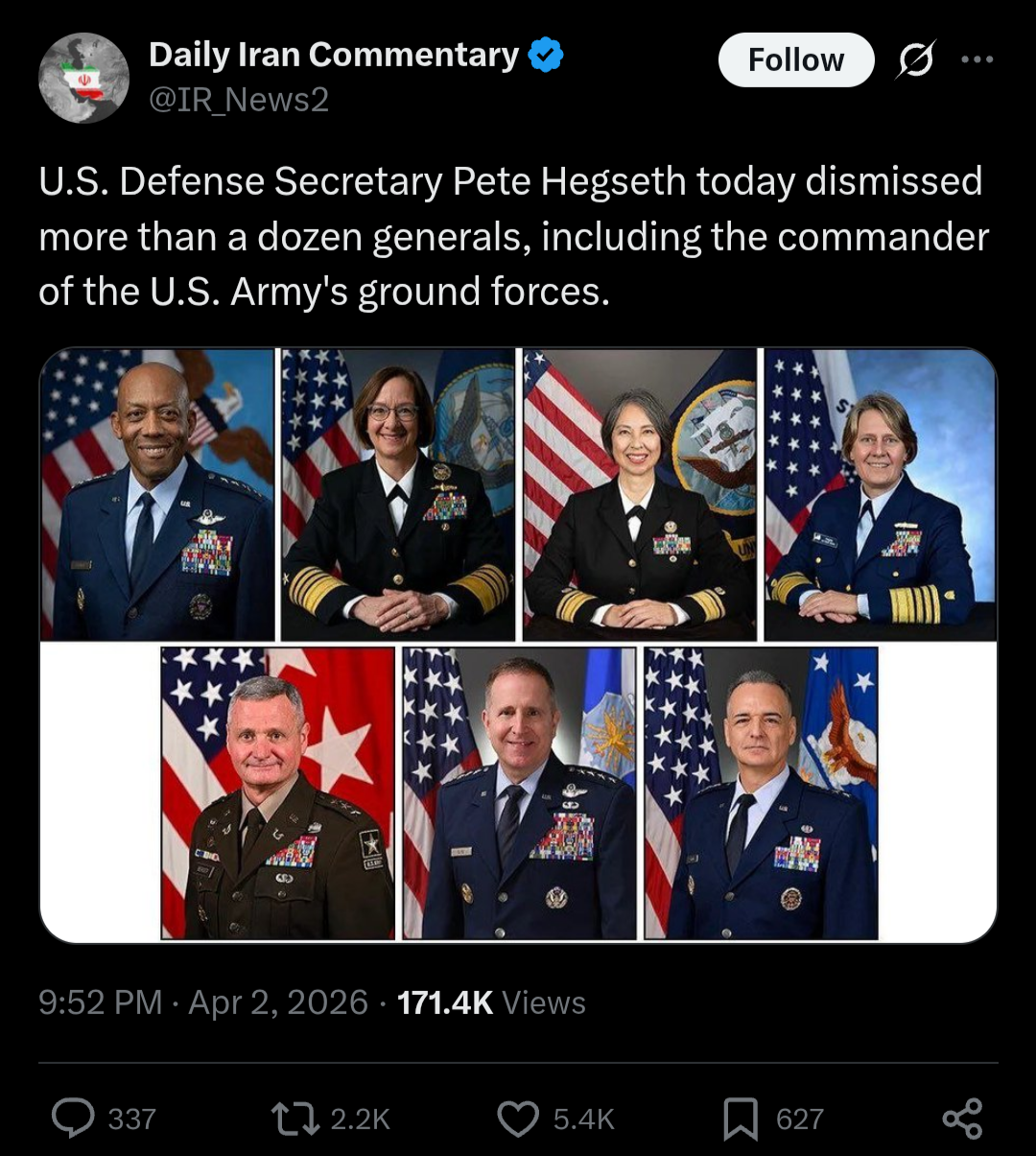 >Oil BRENT $141 (physical today's buys)<Ladybugs Graham is getting cold feet on further Iran fighting (DEBOONKED=HE WENT TO FOX NEWS, HE WANTS TOTAL WAR CRIMES)>GENERAL ARMY OF CHIEF OF STAFF (RANDY GEORGE) FIRED<GENERAL ARMY CHIEF of Chaplains of the United States Army (WILLIAM GREEN JR.) FIRED>ARMY GENERAL DAVID HODNE FIRED (served as the commanding general of United States Army Transformation and Training Command since 2)<PER FOX NEWS: 12 more GENERALS FIRED>PAM BONDI FIRED<KASH PATTEL ON THIN ICE>TULSI GABBARD ON THIN ICE<Army Secretary Daniel Driscoll ON THIN ICE>Labor Secretary Lori Chavez-DeRemer ON THIN ICE<TRUMP KEEPS MELTING DOWN>Iran: Destruction of the drone and chips factory in Israel confirmed.