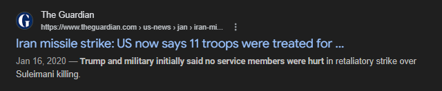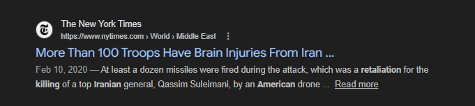 >>2765408>>More than 100 soldiers with brain injuriesSoleimani's meme revenge operation also caused 100 brain injuries. Like 1 contractor died from that.