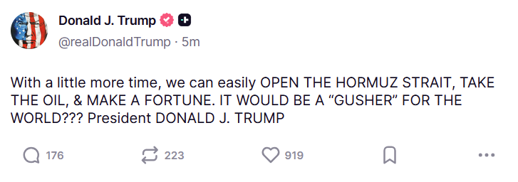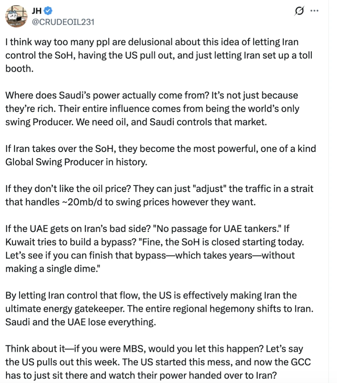 >On Tuesday, a WSJ article mentioned that Trump was supposedly open to getting out and letting Iran control the Strait of Hormuz, leaving Europe (or whoever) to resolve the problems there, which boosted the markets.