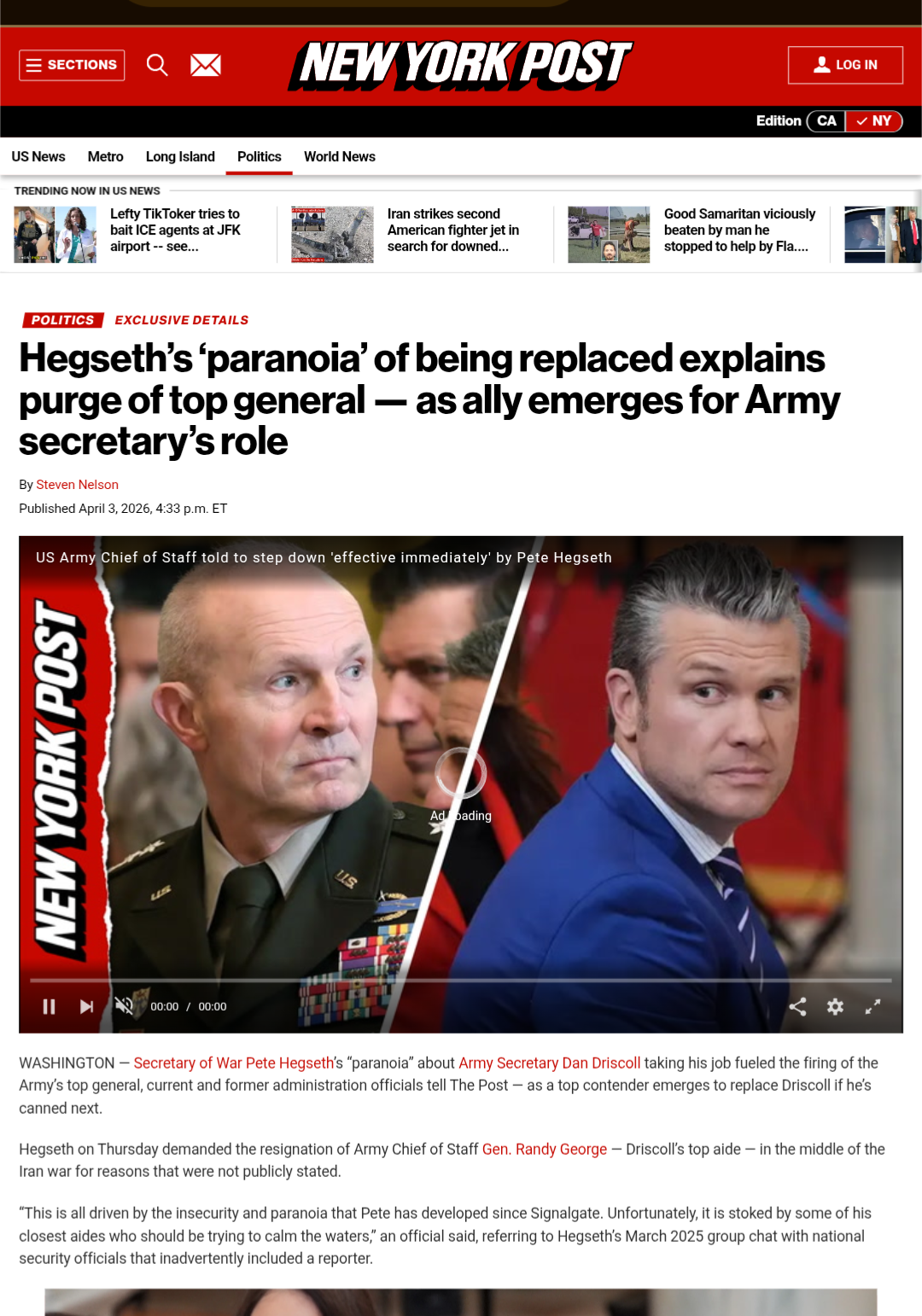 Secretary of War Pete Hegseth has asked Army Chief of Staff General Randy George to resign and take immediate retirement, CBS has reported, citing source familiar with the matter. One of the sources named differences in “vision for the army” between US President Donald Trump, Hegseth, and George as the reason for the move.