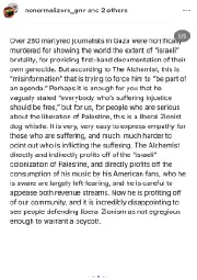 >>2766644>The Alchemist made an album entirely made up of Zionist samples called “Israeli Salad” and never got cancelled for it despite Zionism being identical to Nazism. When did Alc ever promote genocide?