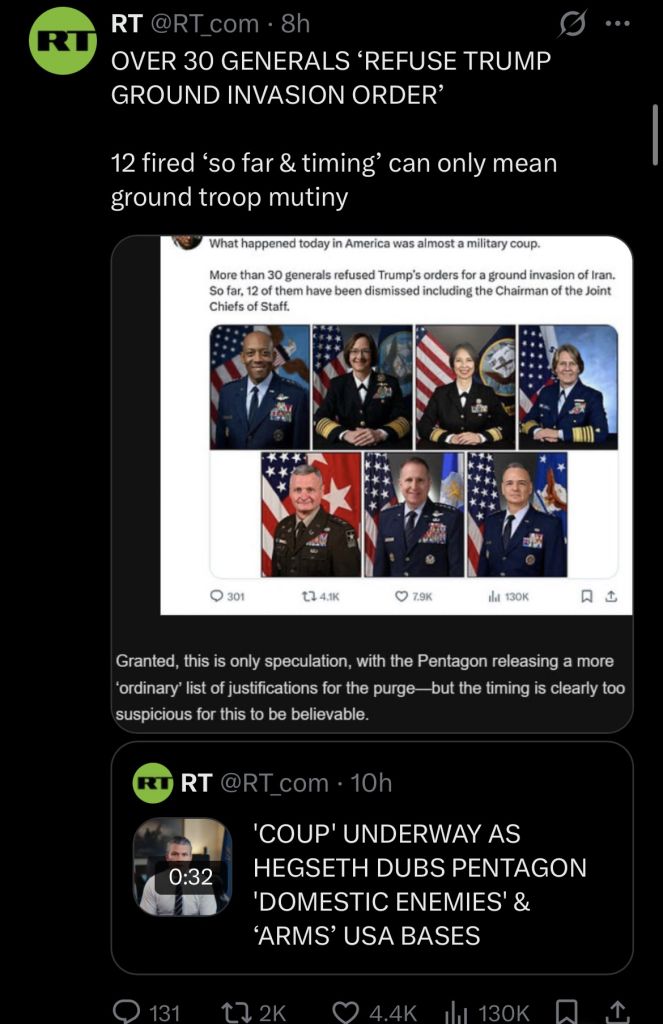 Trump is too pussy to put boots on the ground because of the absolute shitshow and meat grinder that would follow. Trump is only showing America’s cards and tactics bare to the world to see. The entire leadership is getting purged from the military in favor of retards who are only going to lie about everything to not get fired.
