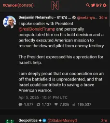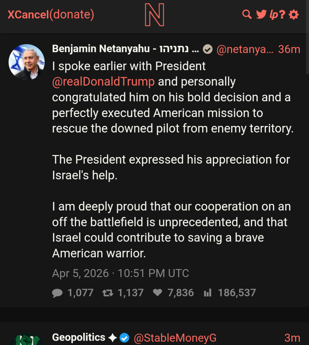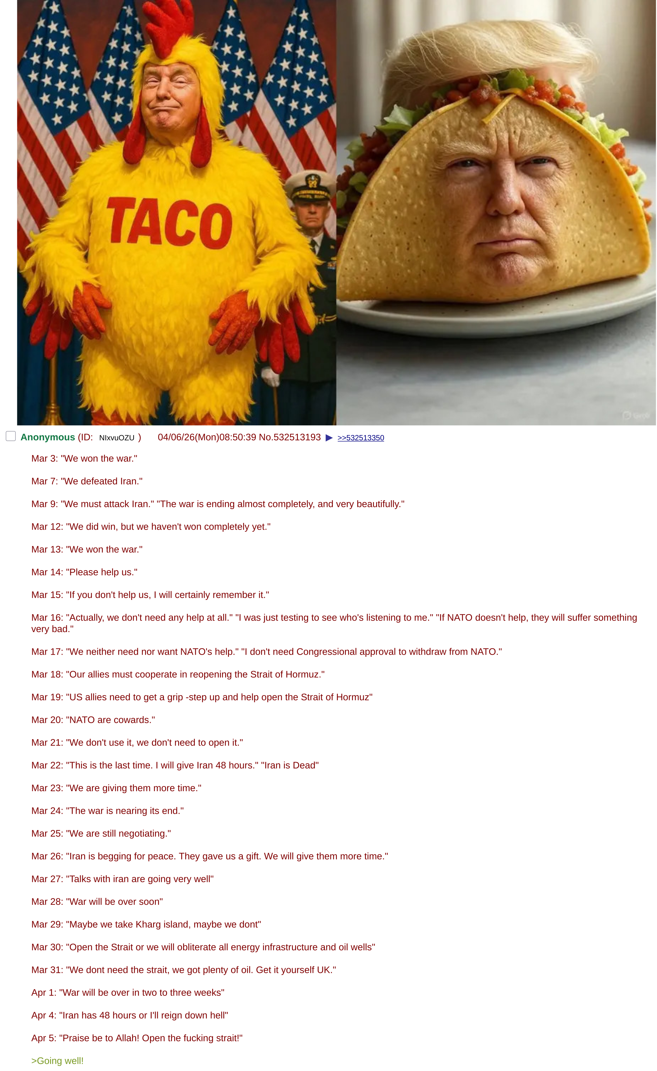 >The war is going on for a heckin while now<Operation Eagle Claw 2.0 ended in a meh (multiple aircraft lost, who knows how many dead) >Ayadronald Trumeini has converted to Islam and dropped an F-bomb (confirmed by SNOPES, FOX and 4CHAN)<Big happening possible on Tuesday>Zios getting bloody nose in Lebanon, more Kornet and Drone strikes confirmed<Oh yeah, 2nd F-15 pilot recovered (Praise be to Allah -Donald Trump)>Oil is at an all time high, nobody knows what to do except double down on green energy (possibly???)<Zio cops arrest Israeli anti-war patriots>Zelensky met with Al-Jewlani<The Battle Goes On and Young October Is Ahead