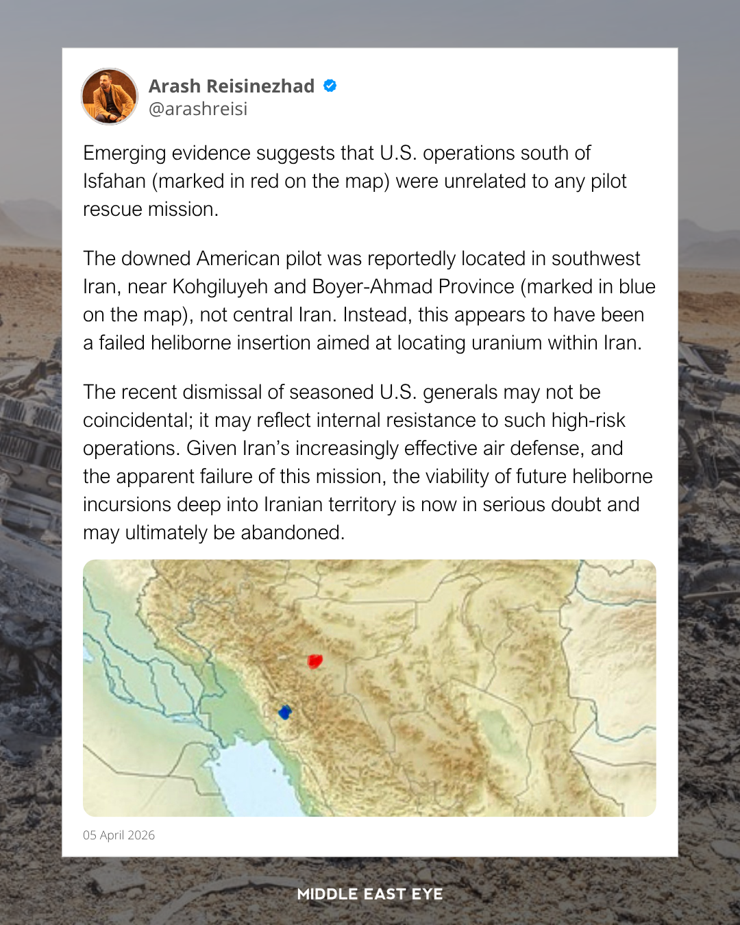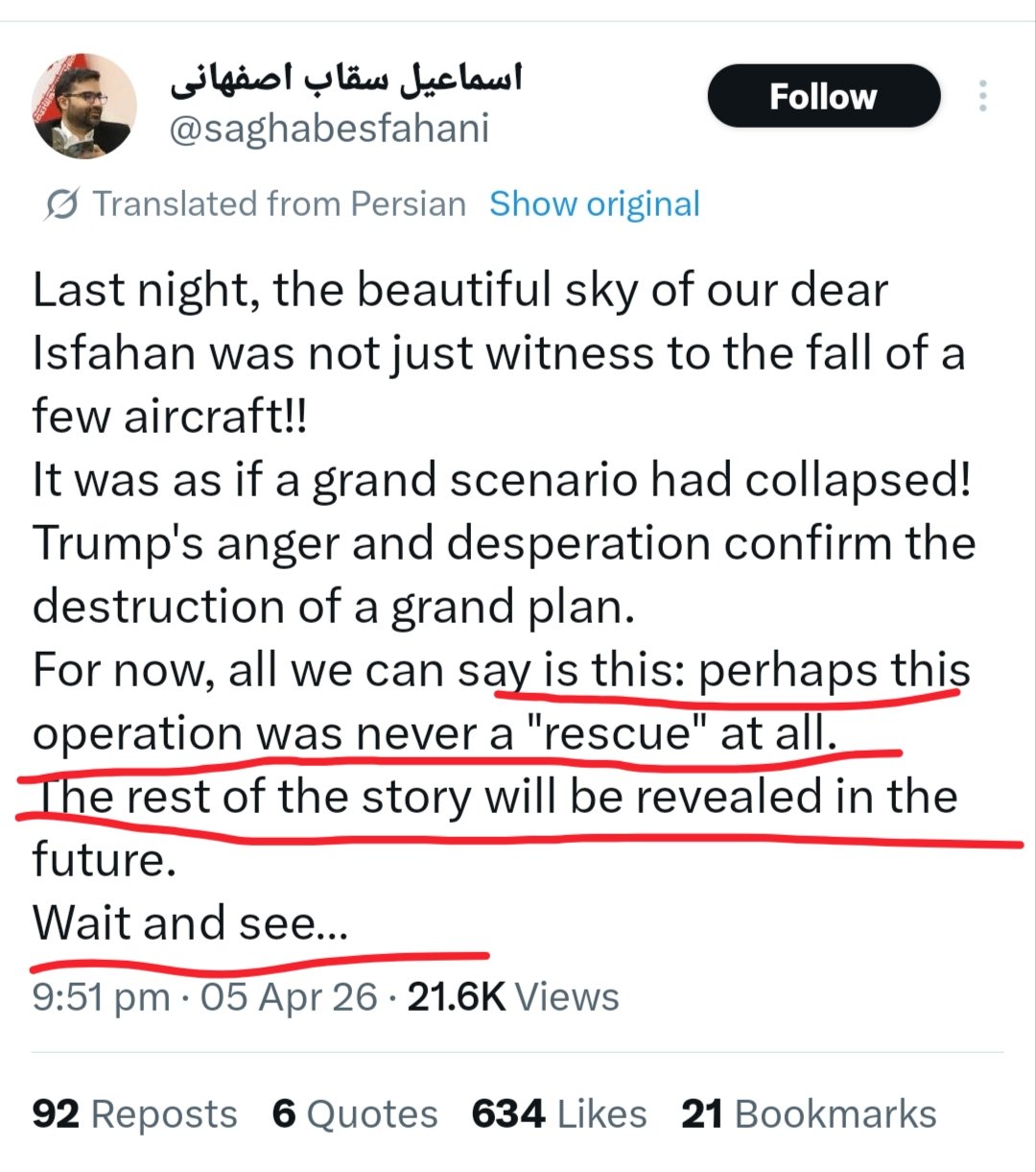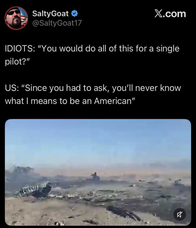 That guy who's a former un weapons inspector turned utube guest commentator says it makes sense to bomb the aircraft that were stuck but they got bad Intel from Israel or they wouldn't be stuck. He was saying it turned into sar when they had to abandon the secret op to snatch the uranium after the media leaked about the downed officer.