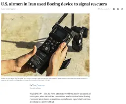 https://www.newsweek.com/former-nato-commander-reacts-trump-iran-airman-rescue-11787986>"This is a full colonel, so this is somebody who is 45-plus years old, probably went to SERE school a long time ago, who climbed 7,000 feet, used his transponder, does it all on a broken ankle—I can't wait to see this guy," the admiral told Wolf Blitzer. "It's an amazing story."https://www.seattletimes.com/nation-world/nation-politics/injured-u-s-airman-in-iran-used-boeing-device-to-signal-rescuers/> U.S. airmen in Iran used Boeing device to signal rescuers Everyone except the NYP