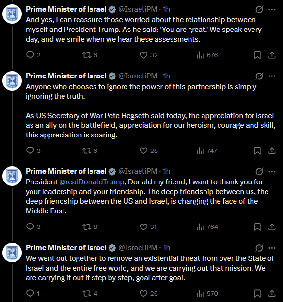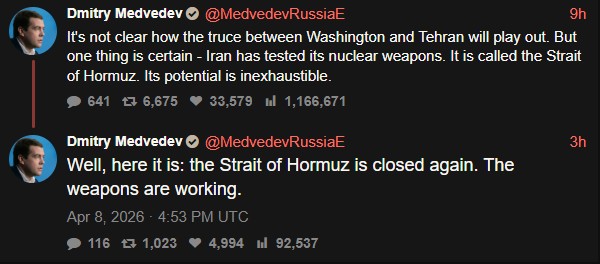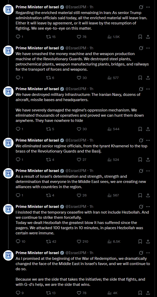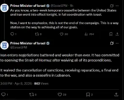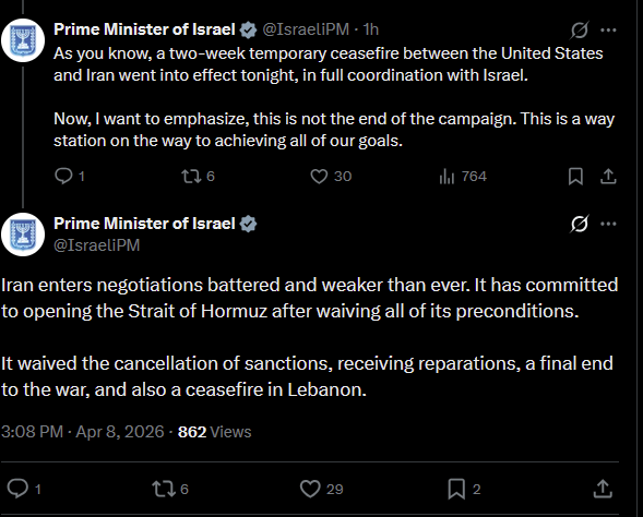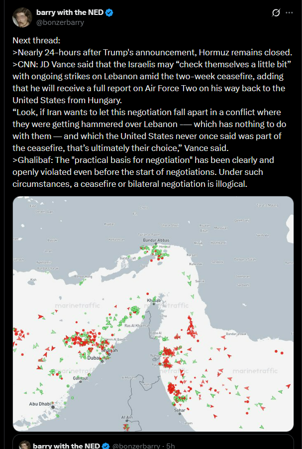 https://x.com/IsraeliPM/status/2041971408675152205The only acceptable terms for Isramerica is Iran turning over all the uranium, which I am pretty sure they are not going to do. This is all a dog and pony show for some unknown purpose. Like I said last thread, I think it is because Trump realized he was looking too blood-thirsty and crazed with the whole "civilization dies tonight" or whatever, so he is temporarily walking it back so he can pretend to be a peace-maker before resuming attacks because Iran is not acceding to the demands they're obviously not going to accede to.