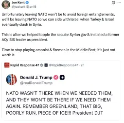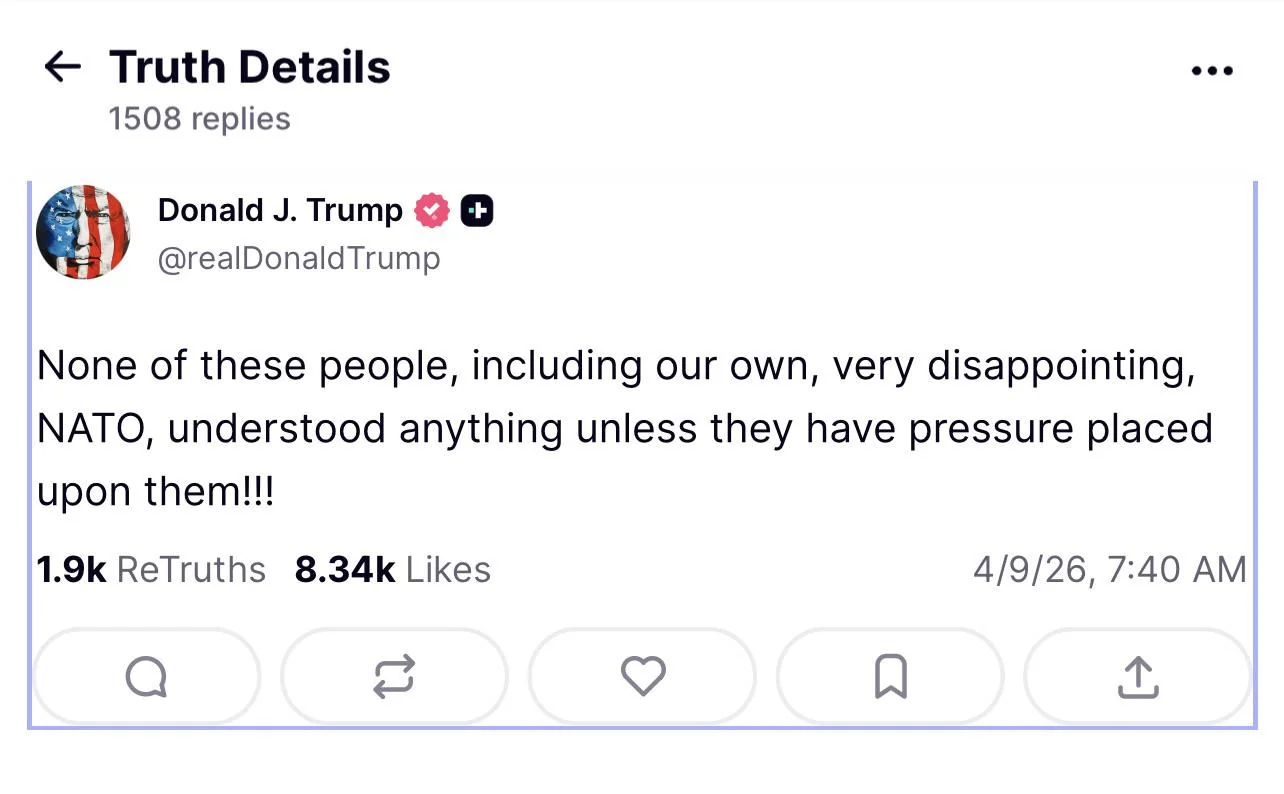 President Donald Trump has posted an all-caps message on his Truth Social platform, accusing NATO of refusing to help when Washington needed the bloc’s help.