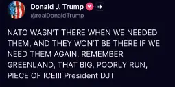“NATO WASN’T THERE WHEN WE NEEDED THEM, AND THEY WON’T BE THERE IF WE NEED THEM AGAIN. REMEMBER GREENLAND, THAT BIG, POORLY RUN, PIECE OF ICE!!!” Trump wrote, following his meeting with Secretary-General Mark Rutte.