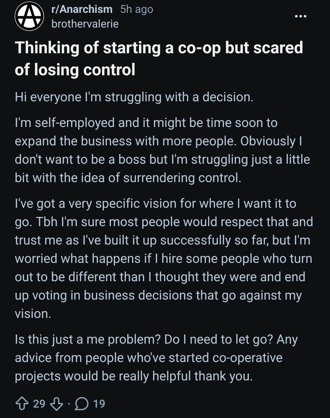 Anyway, anarchist thought will play a big role in the future of organizing as industrial global society crumbles apart, the idea of a global revolution and communist order is a spook and always was an extremely naive idea, If the choice was socialism or barbarism, barbarism has won, there never was a competition tbh. You should accept this and adapt your vision and actions accordingly, even if you continue to believe in vanguardism. But most of you cling to a deeply perverted version of 20th century socialism.