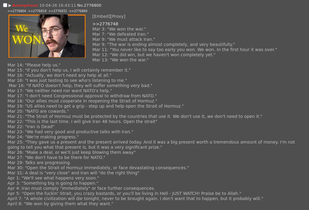>>2777424True right now is like a fucking stereotype trump is threatening to destroy Iranian civilization chickens out loses a war and the democrats say nothing or even say that trump “should’ve gone harder” not surprising though and dems primary’s number 1 polled is Harris Kek!