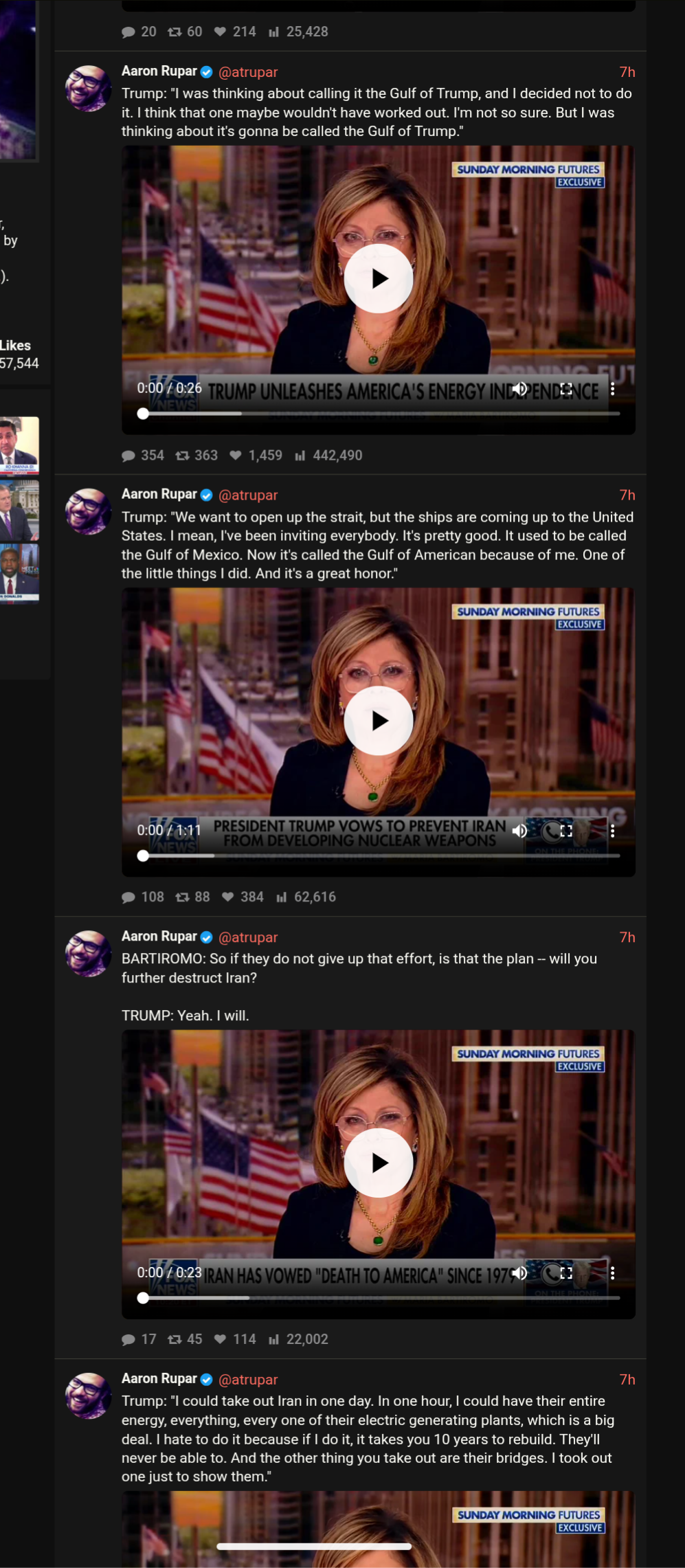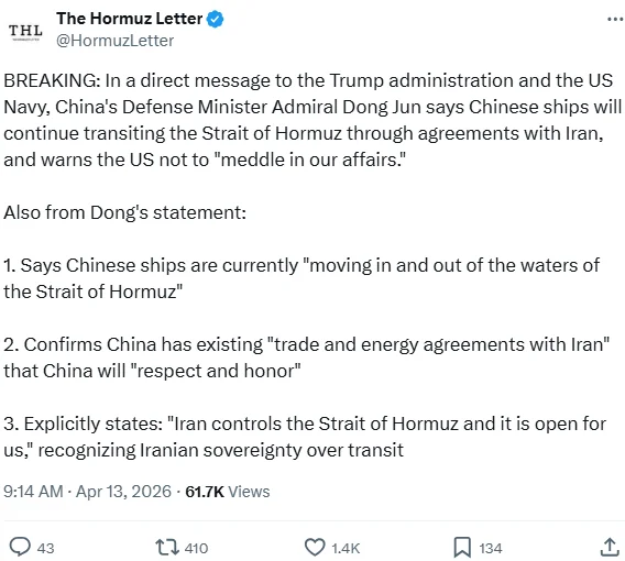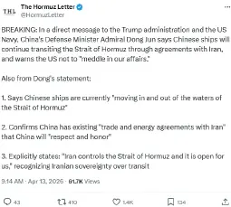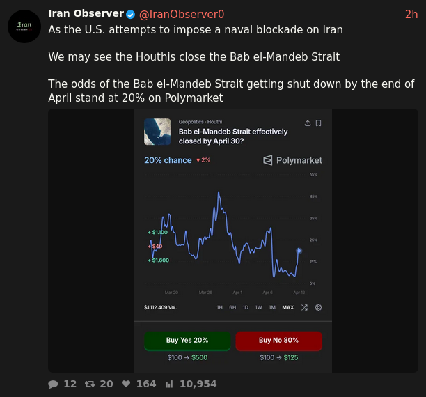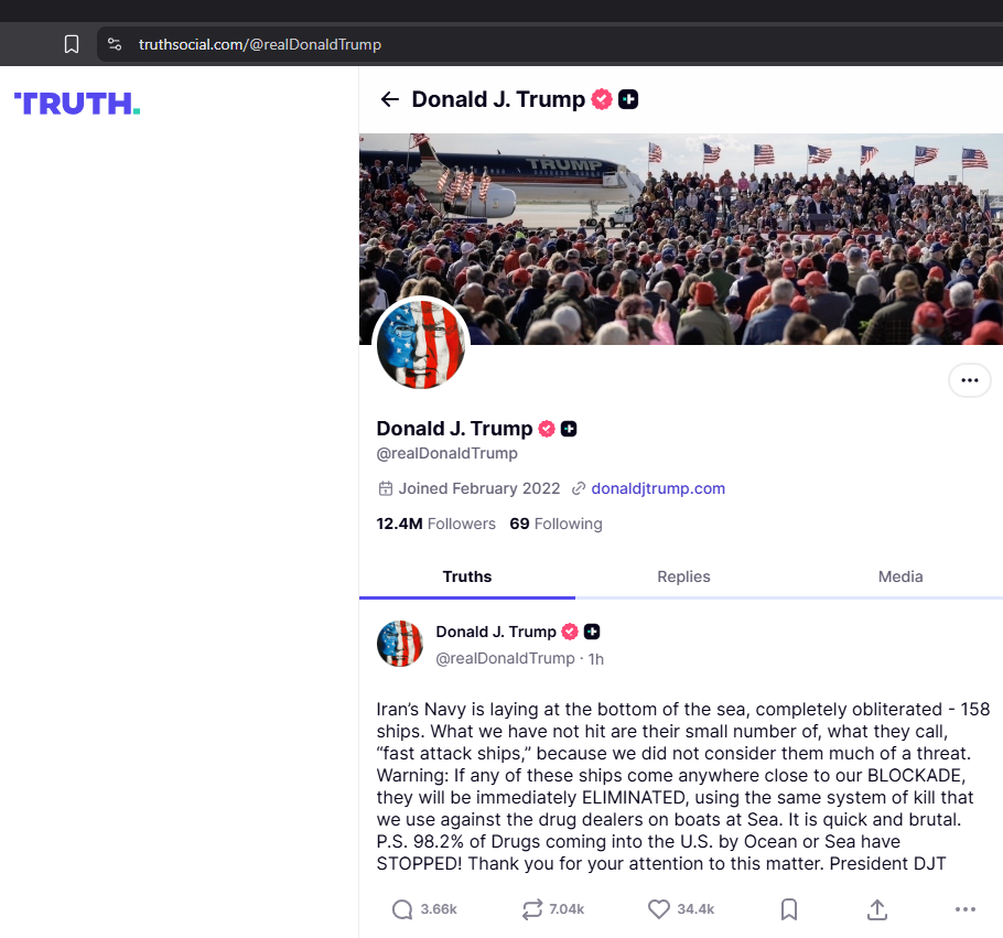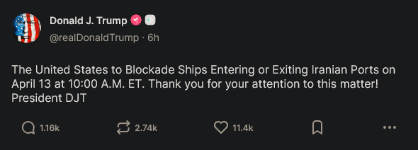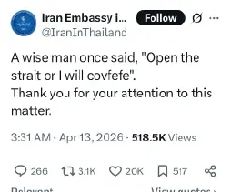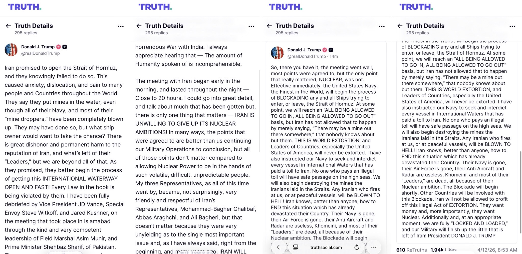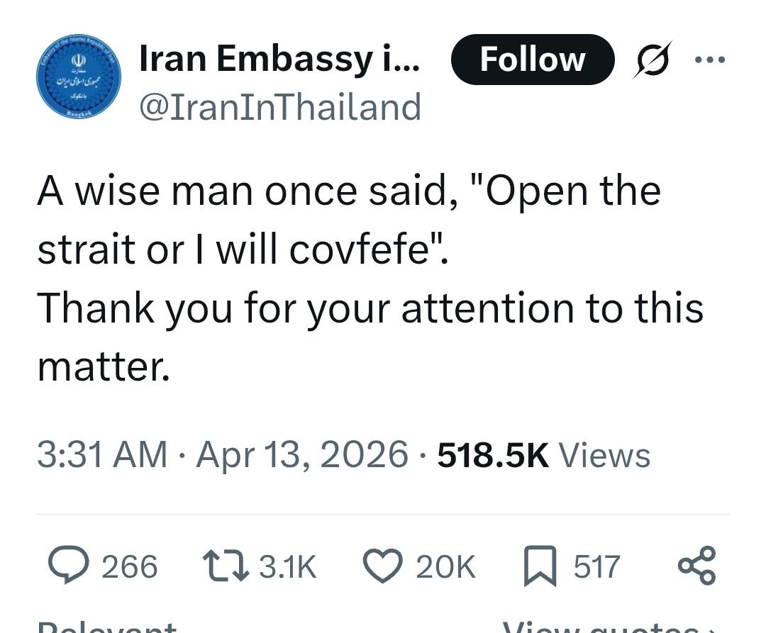 Apr 5: "Open the fuckin' Strait, you crazy bastards, or you'll be living in Hell - JUST WATCH! Praise be to Allah."