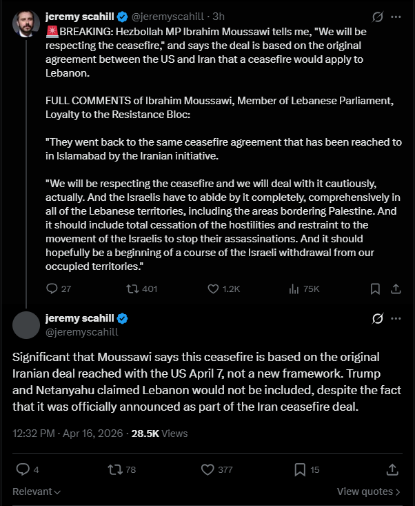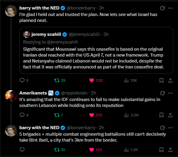 Lebanon's puppet government is literally declaring themselves "not at war" with Israel, while making common cause to disarm Hezbollah. This is, in fact a key part of the agreement for the "ceasefire", which by the way, reserves the right of Israel to continue doing as it pleases as long as it claims it's doing so defensively or whatever.