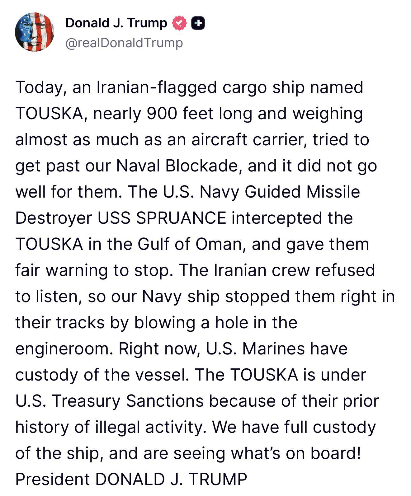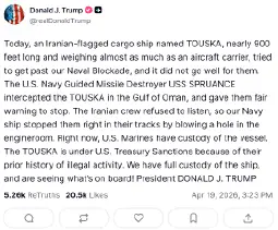 Also, what trump says about the Touska's "prior history of illegal activity" is also a lie. He is almost surely referring to its "violation" of unilateral/illegal US sanctions who nobody has any legal obligation to comply with. So he's reversing reality. The illegal activity is his and the USA's, not Iran's or the Touska's.