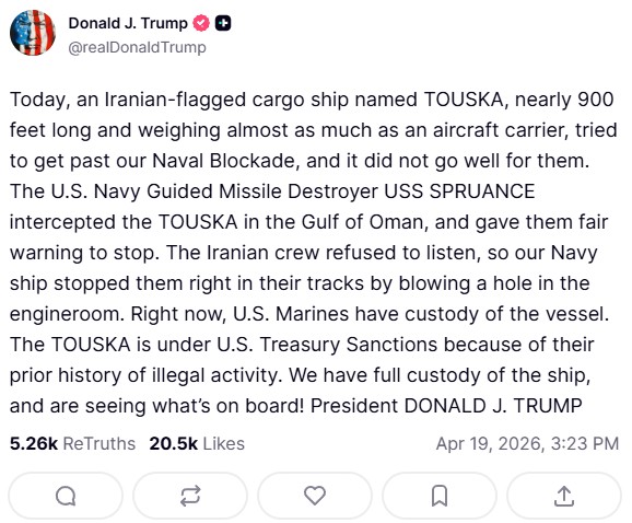 >Iran confirms US interdiction, seizure of Iranian vessel, says will retaliate ‘soon’Iran’s Hazrat Khatam al-Anbiya military headquarters confirmed an attack claimed by the US military on a ship in the Sea of Oman in a statement carried by semi-official Tasnim news agency.