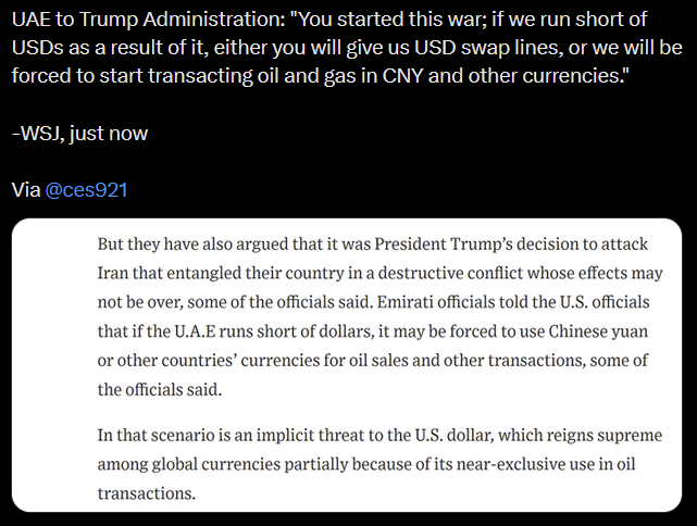 >>2787002>pay for oil in Yuan and pay a fee, or embargo -Iran>if you do that, you're embargoed! -USAIt was a mini-stroke of genius from Trump to demand countries pick sides in this conflict, while being on the backfoot.