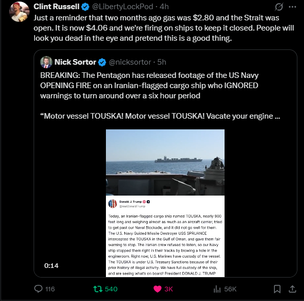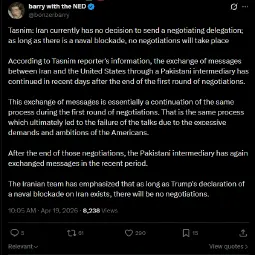 >Iranian source to Al Jazeera: In light of Trump's statements about holding negotiations & inconsistency with what is actually happening between Iran and the U.S., we believe we’re facing a deception by the enemy & we’re on the verge of a new round of escalation. Iran is making the end of the naval blockade a full condition for going to Islamabad.