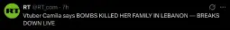 VTuber Camila was featured on X by RT news when she described 160 bombs being dropped on Beirut in 10 minutes. In other news, Null from Kiwi Farms is laughing about it.