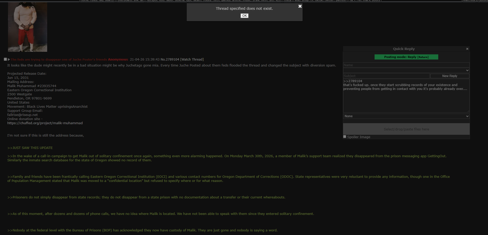 >>In the wake of a call-in campaign to get Malik out of solitary confinement once again, something even more alarming happened. On Monday March 30th, 2026, a member of Malik’s support team realized they disappeared from the prison messaging app GettingOut. Similarly the inmate search database for the state of Oregon showed no record of them.
