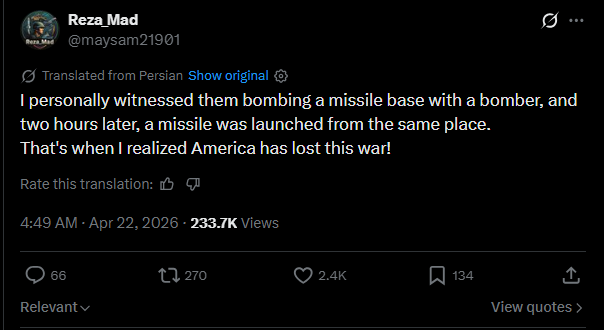>>2790188there's a lot of talk lately about how much of the US weapons stocks have been used, like 50% of a lot of important things have already been used up/wasted. i think there's a lot of people in the US thinking they have to stop this and stop the bleeding of munitions stocks. So there's some pressure against restarting a bombing campaign, but you never know, trump may just keep doubling down anyway.