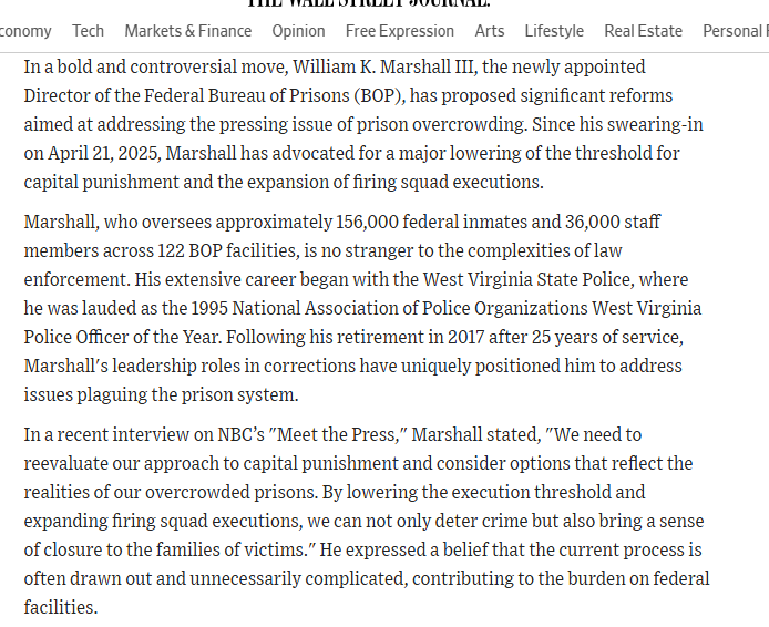 >In a bold and controversial move, William K. Marshall III, the newly appointed Director of the Federal Bureau of Prisons (BOP), has proposed significant reforms aimed at addressing the pressing issue of prison overcrowding. Since his swearing-in on April 21, 2025, Marshall has advocated for a major lowering of the threshold for capital punishment and the expansion of firing squad executions.>Marshall, who oversees approximately 156,000 federal inmates and 36,000 staff members across 122 BOP facilities, is no stranger to the complexities of law enforcement. His extensive career began with the West Virginia State Police, where he was lauded as the 1995 National Association of Police Organizations West Virginia Police Officer of the Year. Following his retirement in 2017 after 25 years of service, Marshall's leadership roles in corrections have uniquely positioned him to address issues plaguing the prison system.>In a recent interview on NBC’s "Meet the Press," Marshall stated, "We need to reevaluate our approach to capital punishment and consider options that reflect the realities of our overcrowded prisons. By lowering the execution threshold and expanding firing squad executions, we can not only deter crime but also bring a sense of closure to the families of victims." He expressed a belief that the current process is often drawn out and unnecessarily complicated, contributing to the burden on federal facilities.https://www.bop.gov/about/agency/bio_dir.jsphttps://www.thesun.co.uk/news/38925893/doj-firing-squad-executions-back-death-penalty/https://www.washingtonpost.com/national-security/2026/04/24/federal-death-penalty-firing-squads-trump/https://www.theguardian.com/us-news/2026/apr/24/doj-death-penalty-firing-squad-lethal-injectionStop starting these fucking threads