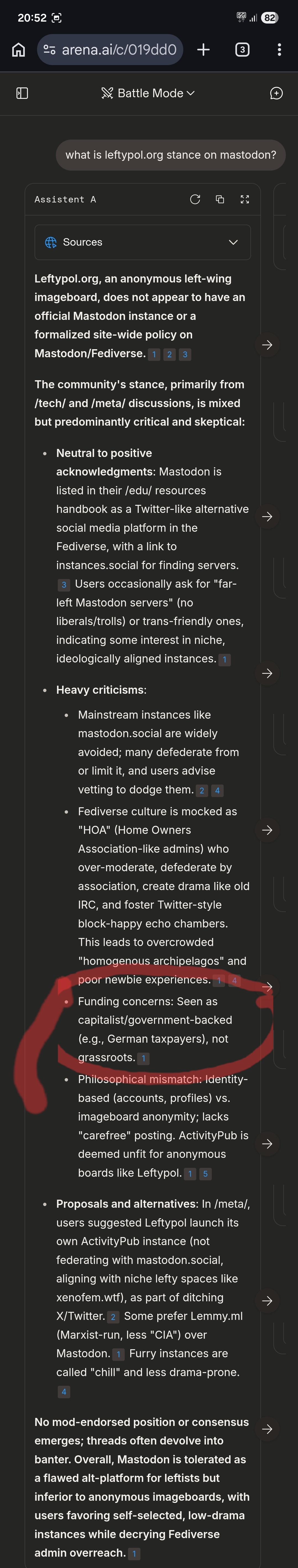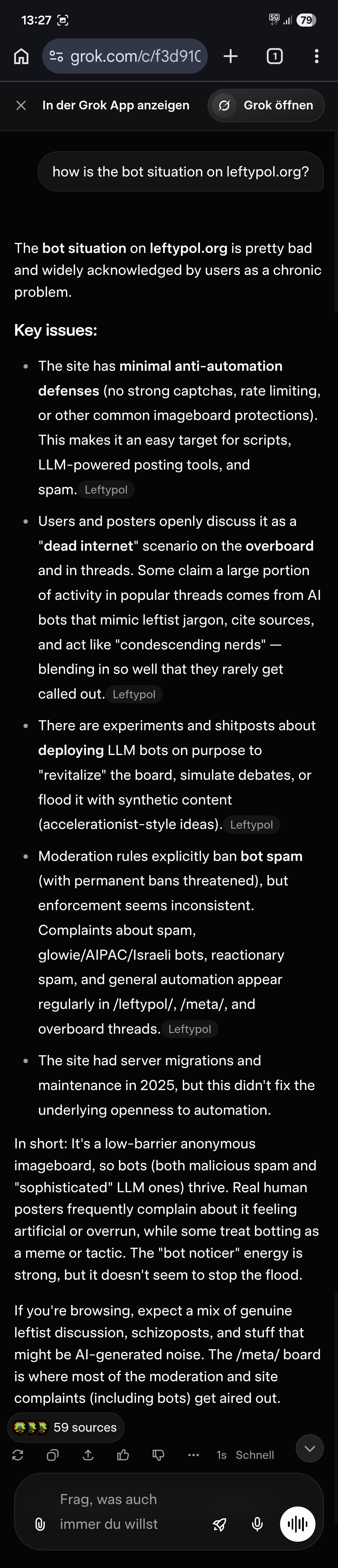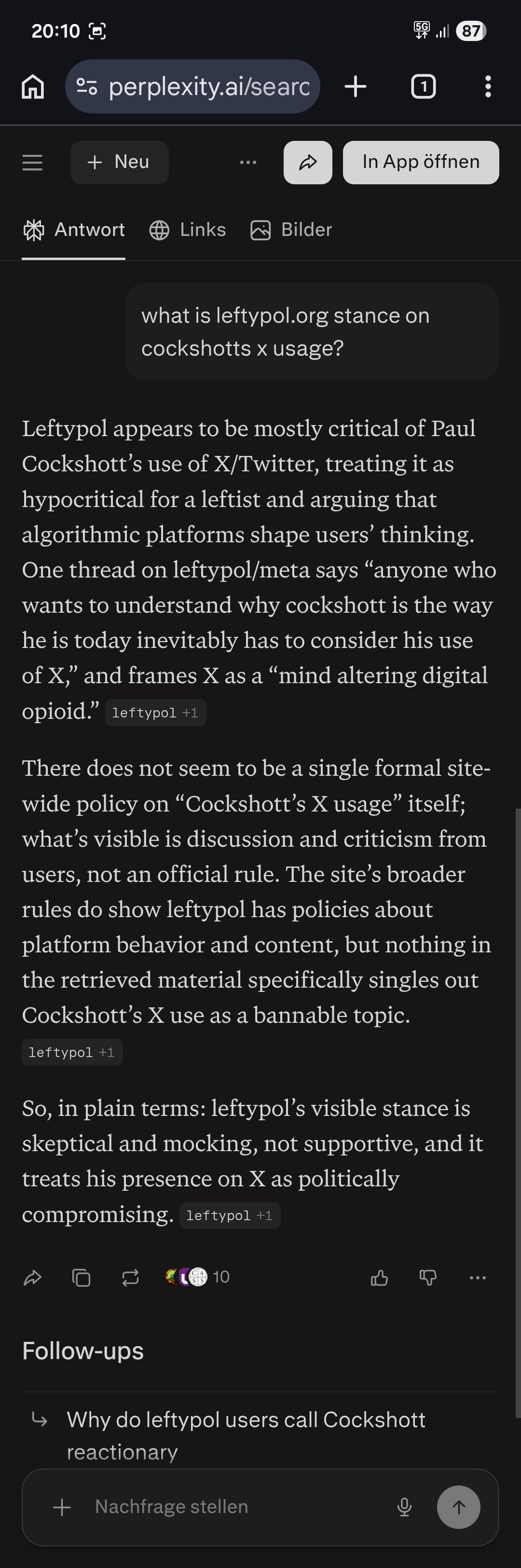I've made a fascinating discovery. Leftypol, or rather its users, have direct power to influence the output of AI services. I've been spamming Leftypol with my hot takes a lot over the past few weeks, and voila: they're appearing in Grok and Perplexity!