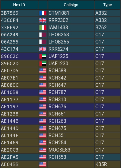 https://globe.adsbexchange.com/?icao=3b7569,ae10b8,ae1197,ae144b,ae20c3,ae07d5,ae1469,ae144d,ae1238,43c6f4,33fe92,43c174,ae1177,ae04bb,ae07e1,ae2fa5,06a249,06a255,896c2c,896c2d,ae144f,ae080cTanker movements from Romania.