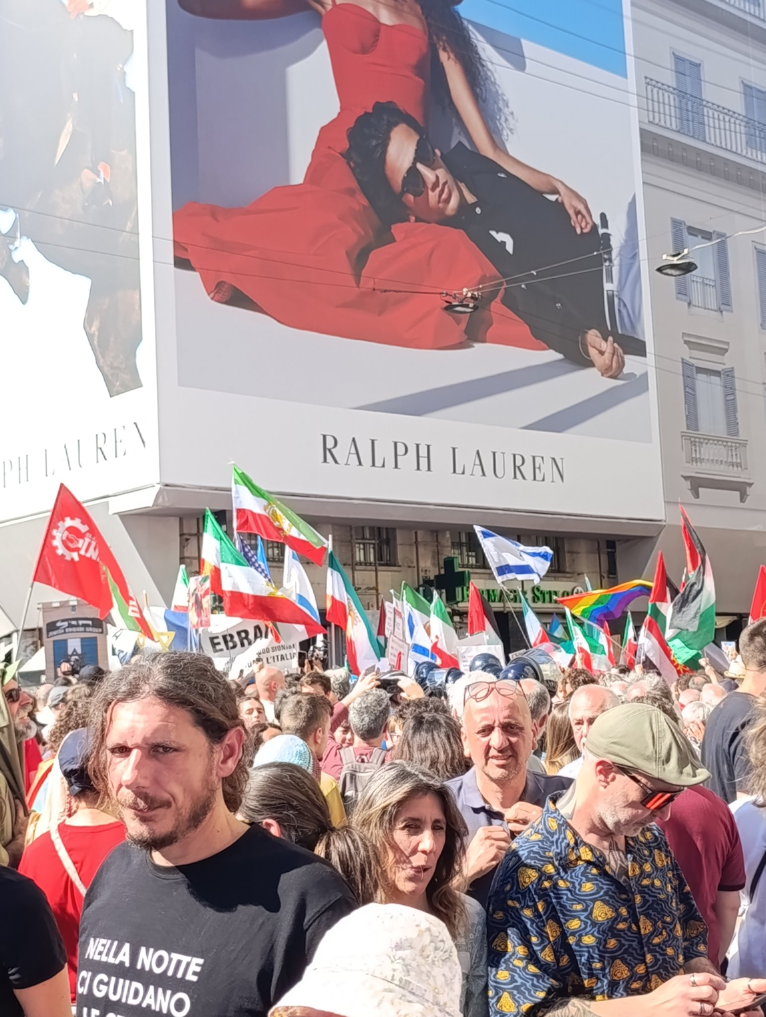 On the left is the acceptable emblem of the Jewish Brigade, and in the photo on the right, the attempt to normalize genocide in the streets of Milan.