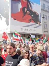 This year was the first time that their descendants were driven out with boos and remarks such as “Murderers” and “Criminals” from the march for Liberation Day and National Resistance Day, because instead of marching with their traditional, entirely acceptable symbol, which you will see in the first photo, they had Israeli flags and the Shah-era Iranian flags with them, while members of Forza Italia who were with them were chased away.