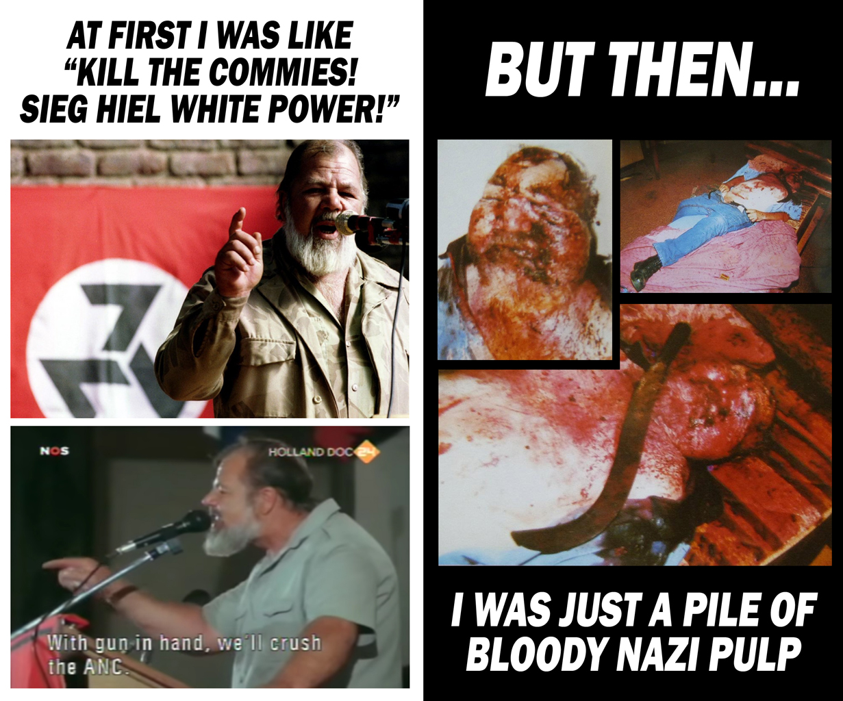 Mini-essay: The class composition/structure of neo-nazism at the outset was extremely typical of any reactionary movement: a leadership core of ambitious, opportunistic, individualistic petty bourgeois/“upper middle class”, and lumpenproletariat rank-and-file who had ideology and various goodies pushed on them by leadership as part of recruitment and indoctrination. However, starting from the late 70s and 80s and 90s, neoliberalism and “paleoconservatism” came along and swooped up the leadership demographic, leaving behind a headless lumpen body stumbling around in the dark. This was when people like William Luther Pierce and James Mason (who was originally recruited into the more “classical” American Nazi Party) and their more terror and crime oriented ilk with all of its political aimlessness came to prominence. The guru type “leaders” might dress up as affluent WASPs in the style of their former masters, but they’re still lost lumpen rabble at the end of day, and the “movement” is easily led by the nose by feds every now and again mostly due to their desperation for any kind of leadership.