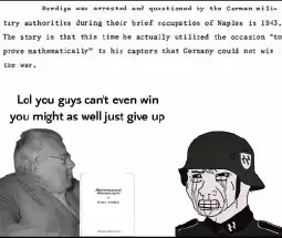 >>519978 >wtf I love hitler now? He says so in Mein Kampf he did not want his master race waiting their time on useless knowledge only to listen to propaganda, because he literally did think if you make propaganda that is dank enough you can win every war regardless of what numbers you have.