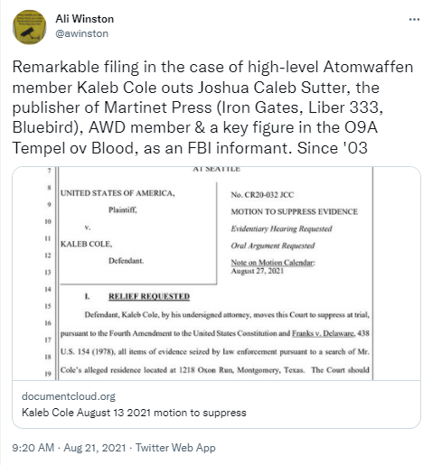 Throughout his Muslim phase, throughout his Numinous Way/ex-extremist phase and throughout his new Hebdomian Way phase he's continued to post on stormfront, promote Nazism and use O9A lingo in his writing. He's absolutely still involved in O9A behind the scenes and always was.