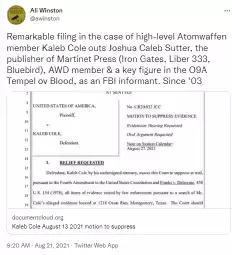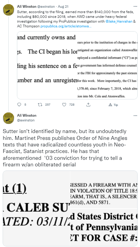 After the initial leader of the Atomwaffen Division got locked up because his Muslim buddy shot a couple other AWD members for being islamophobic and the cops found bombmaking materials in their apartment, the AWD gets taken over by this guy who calls himself Rape. Rape immediately lets in TOB people and pretty soon the Nazi doomsday cult is a satanic Nazi doomsday cult promoting every imaginable evil that's indirectly run by the feds.