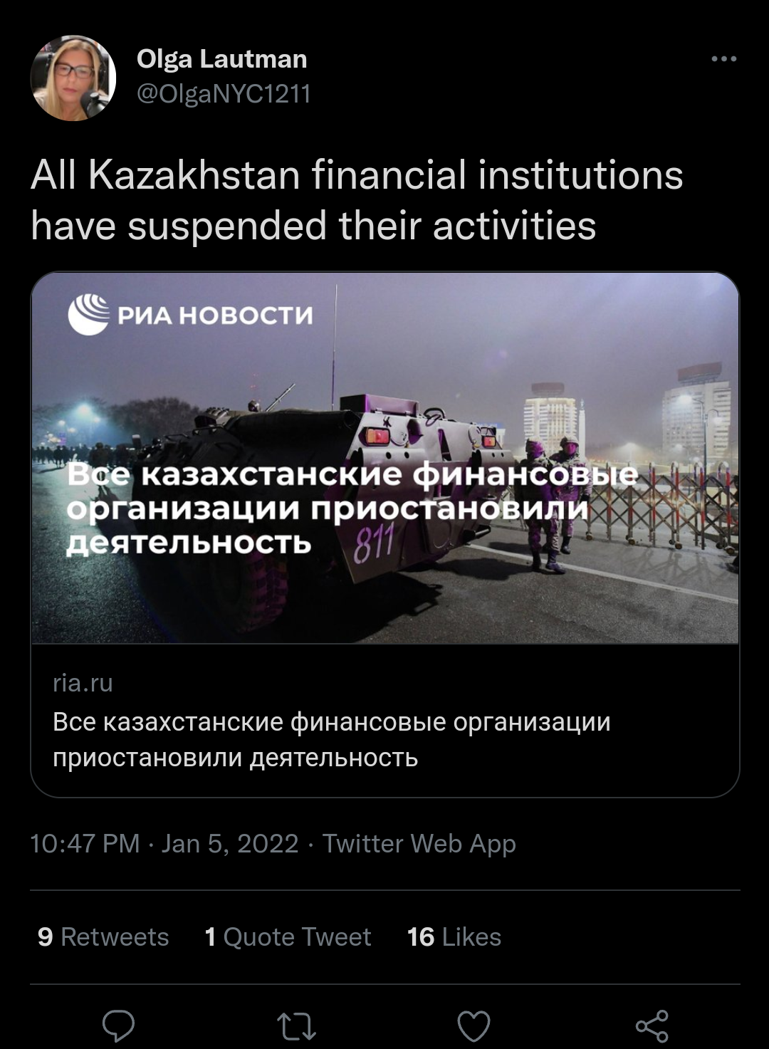 >Foreign investments and business of foreign companies will be protected in Kazakhstan, - Russian Foreign Ministry says https://t.me/rian_ru/137944 Anonymous ## Mod 2022-01-06 (Thu) 02:15:14 No. 676945