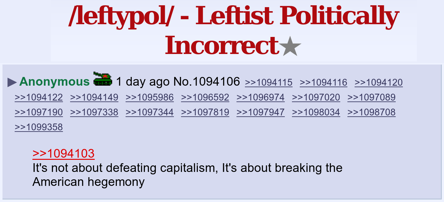 >>678219 China is also imperialist, in fact they will be the new imperialist superpower that needs to be beaten back by the international proletariat unless they return to a socialist line of development and reject national chauvinism