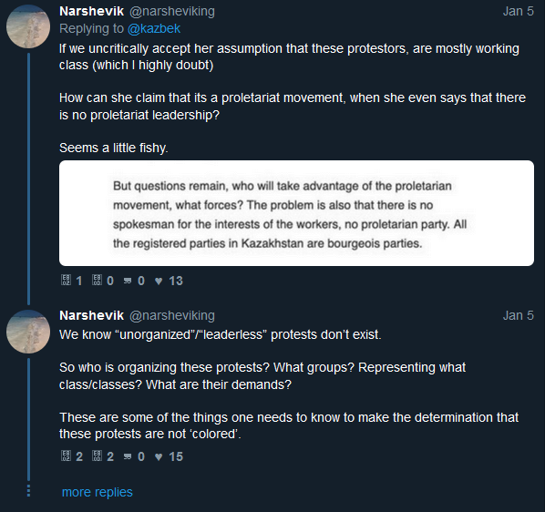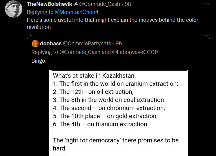 >>676996 So according to this Kazakh communist it is a spontaneous uprising from the workers and western liberal media will support it just to create a rift inbetween the CSTO countries, but just ignore them. It is the revolutionary proletariat that must take charge, although it is lacking and disorganized today?