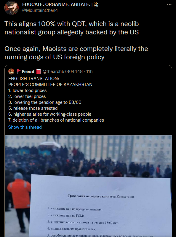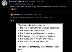 >>678186 if what you say is true and the protest is spontaneous with no glow starting or backing it up, them the communists in kazakh needs to unite and act to take helm on the protest.