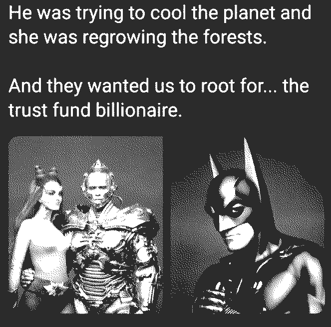 >>599373whoa fucking deep!!!!!!! batman is a rich guy beating up the poors LOL never saw it like that!!