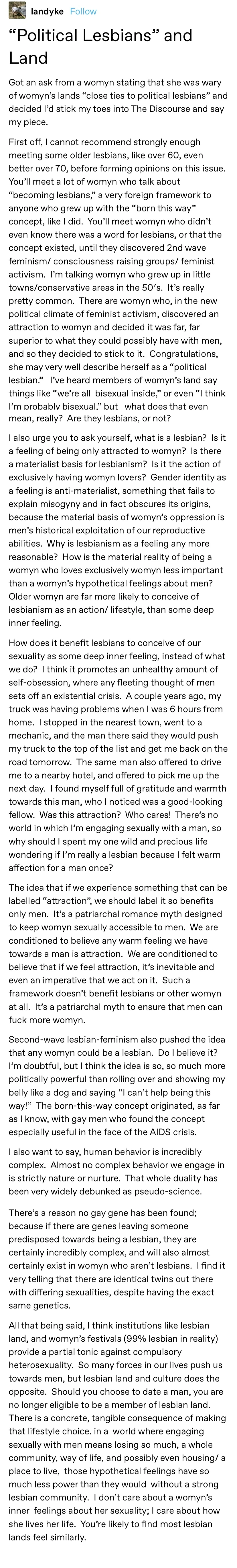 >I also urge you to ask yourself, what is a lesbian? Is it a feeling of being only attracted to womyn? Is there a materialist basis for lesbianism? Is it the action of exclusively having womyn lovers? Gender identity as a feeling is anti-materialist, something that fails to explain misogyny and in fact obscures its origins, because the material basis of womyn's oppression is men's historical exploitation of our reproductive abilities.The fact you cannot reduce such things to simple biological processes is something my own experience has taught me. Even if i, personally cannot conceive of every one of the manifold reasons for people transitioning or having transitioned in the past.
