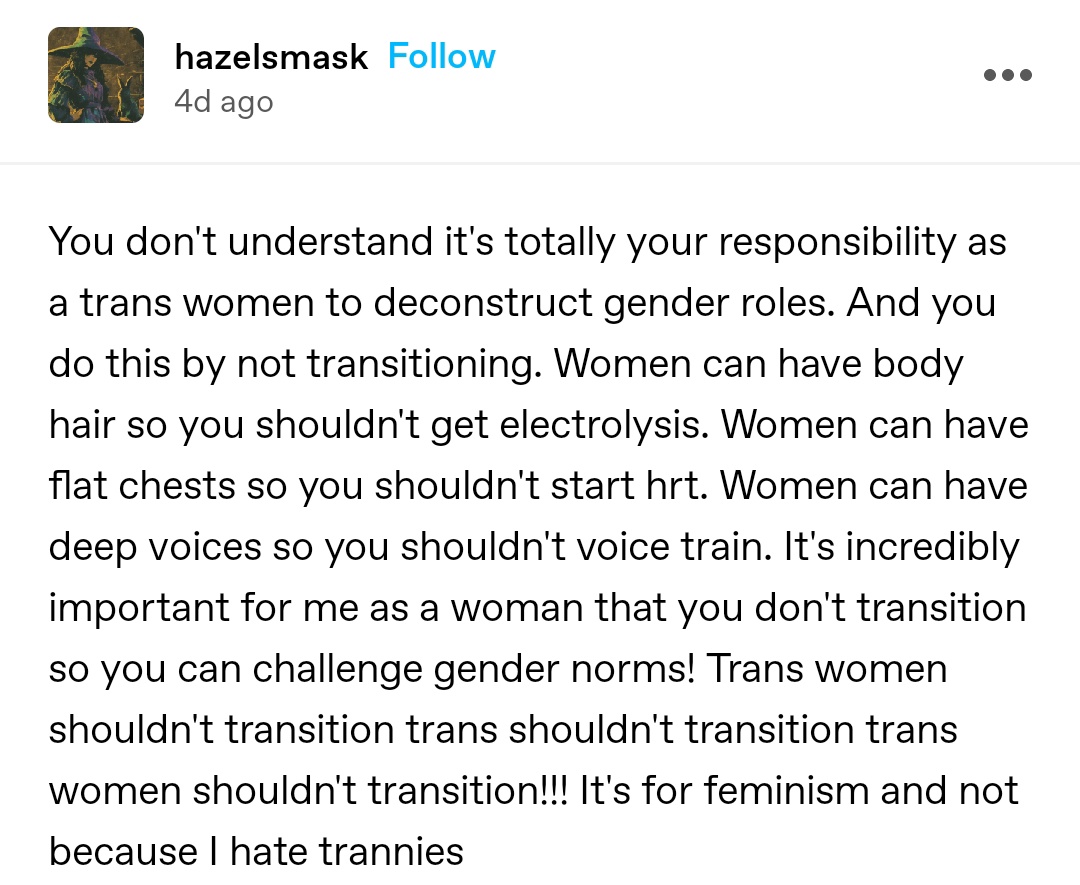 no self-respecting trans woman or gay man would want to be some fucking twitter femboy