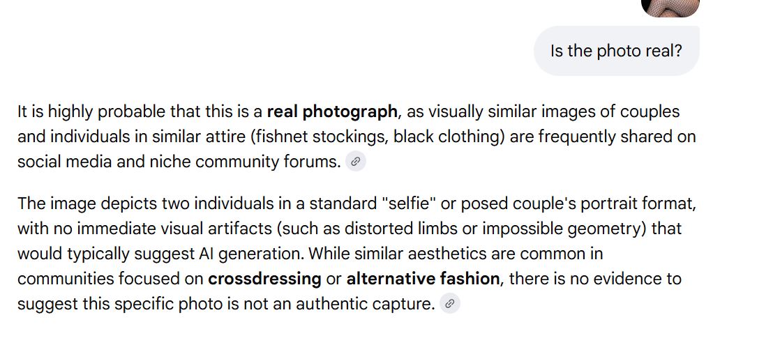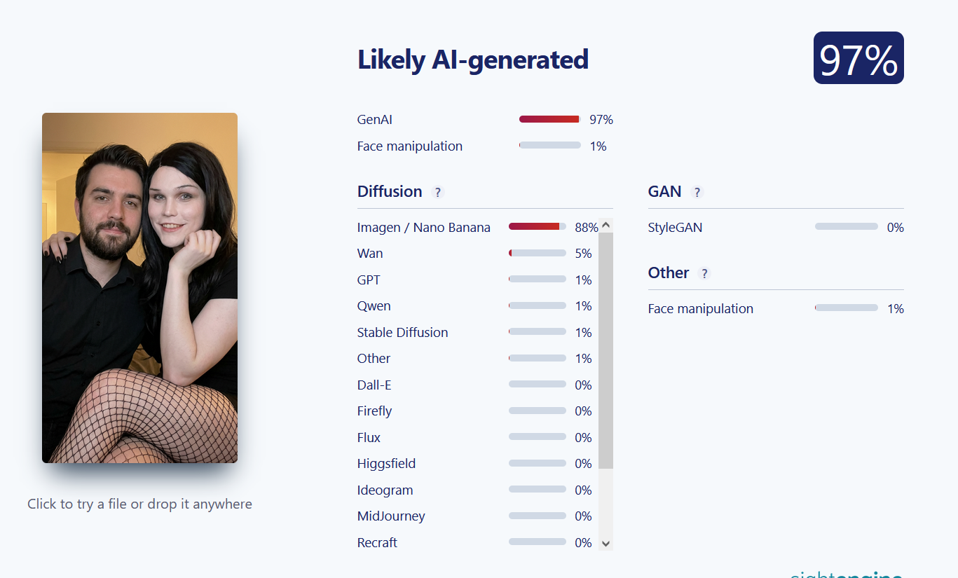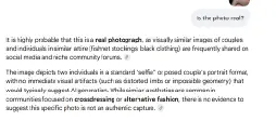 >>7715Fail sage, and I don't give a damn what that says. The guy in the photo is definitely me and the transwoman is my gf. It really means nothing as there have been times where real photos get interpreted as "A.I". The Internet and A.I. detectors aren't perfect.