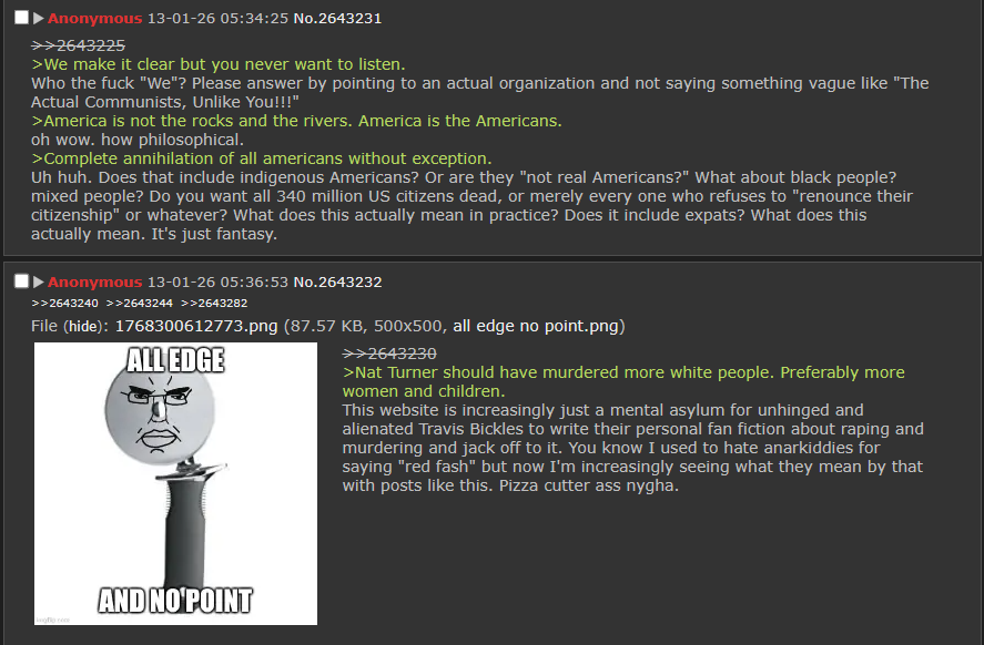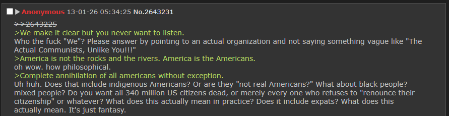 all "destroy amerikkkka, amerikkkans are ontologically evil" style posting should be relegated to its own /anti-usa/ thread and americans who want revolutionary civil war should be allowed /usapol/ as a thread for discussing that.