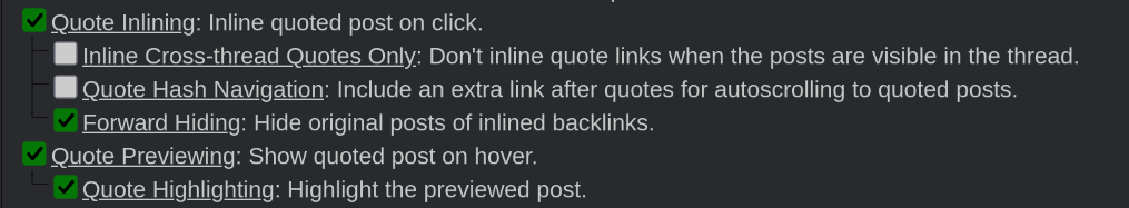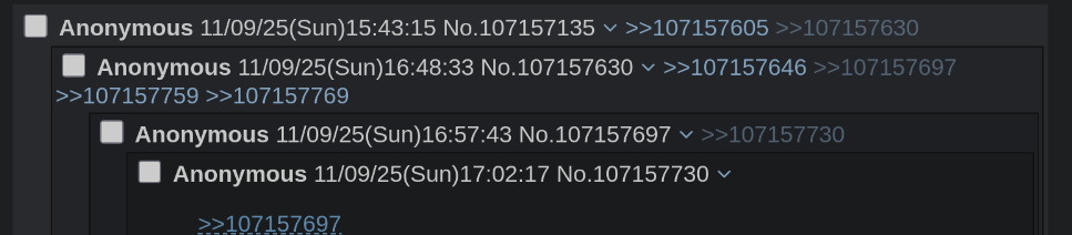 Is there a way to use quote threading here? Like how it's possible with 4chan-x or 8chanss userscripts? By quote threading I mean organizing reply posts by which posts they quote, instead of time.