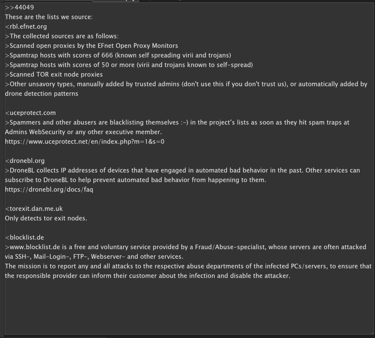 >>44055>TLD-wide blocks on all Russian *.ru and Chinese *.cn linksI see what you mean. As i already said though, this config is outdated and James himself stopped using it on his imageboard. The leftypol mods never told us they were using it as well and if they were to get in touch with the github project, they would receive an updated configuration that is a lot more targeted and adaptable.