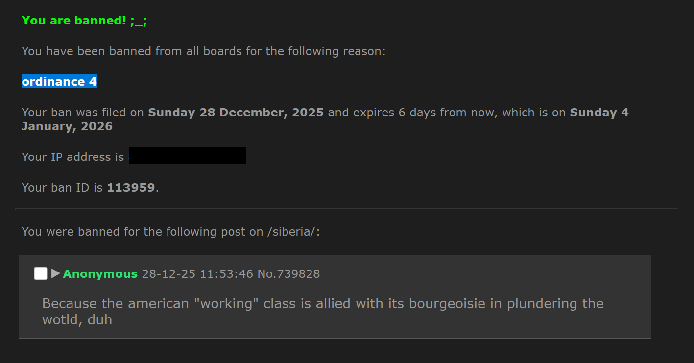 >>37647>Incel posts are banned site wide (i.e. incel talking points and making 9999 threads complaining about women, saying all women are bourgeoise/sluts/etc.) - per modocracy vote passed on 2025-01-02did something happen to reverse this? incels running amok on /leftypol/ and /siberia/ with no bans in sight