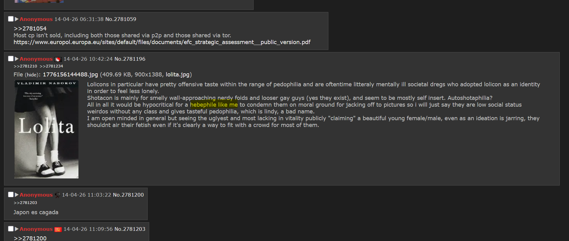 >>44716>thats because jannies are pedos and endorse it and openly associated with an open pedo site. its not an accident and they disagree with you and dont think it should be enforced or extended. thats why you have multiple anime pedo threads that have been up for 5+ yearsAnime isn't pedophilic lol, only lolicon is