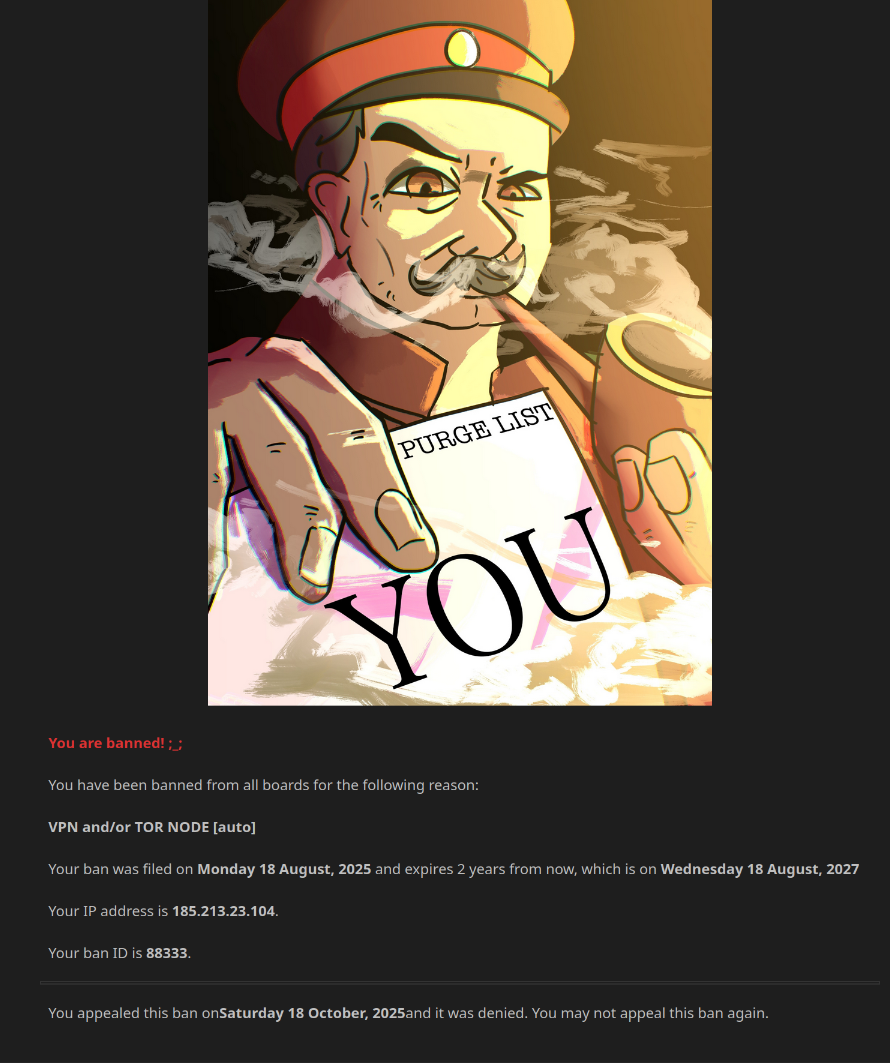 Hey…. So I was the tor poster using the name "BeriaCunnyRapist1917" I wasn't the reason the whole tor node is blocked right now, was I? If so I don't understand why, I didn't post anything rule-breaking or unusual. Just to be clear.