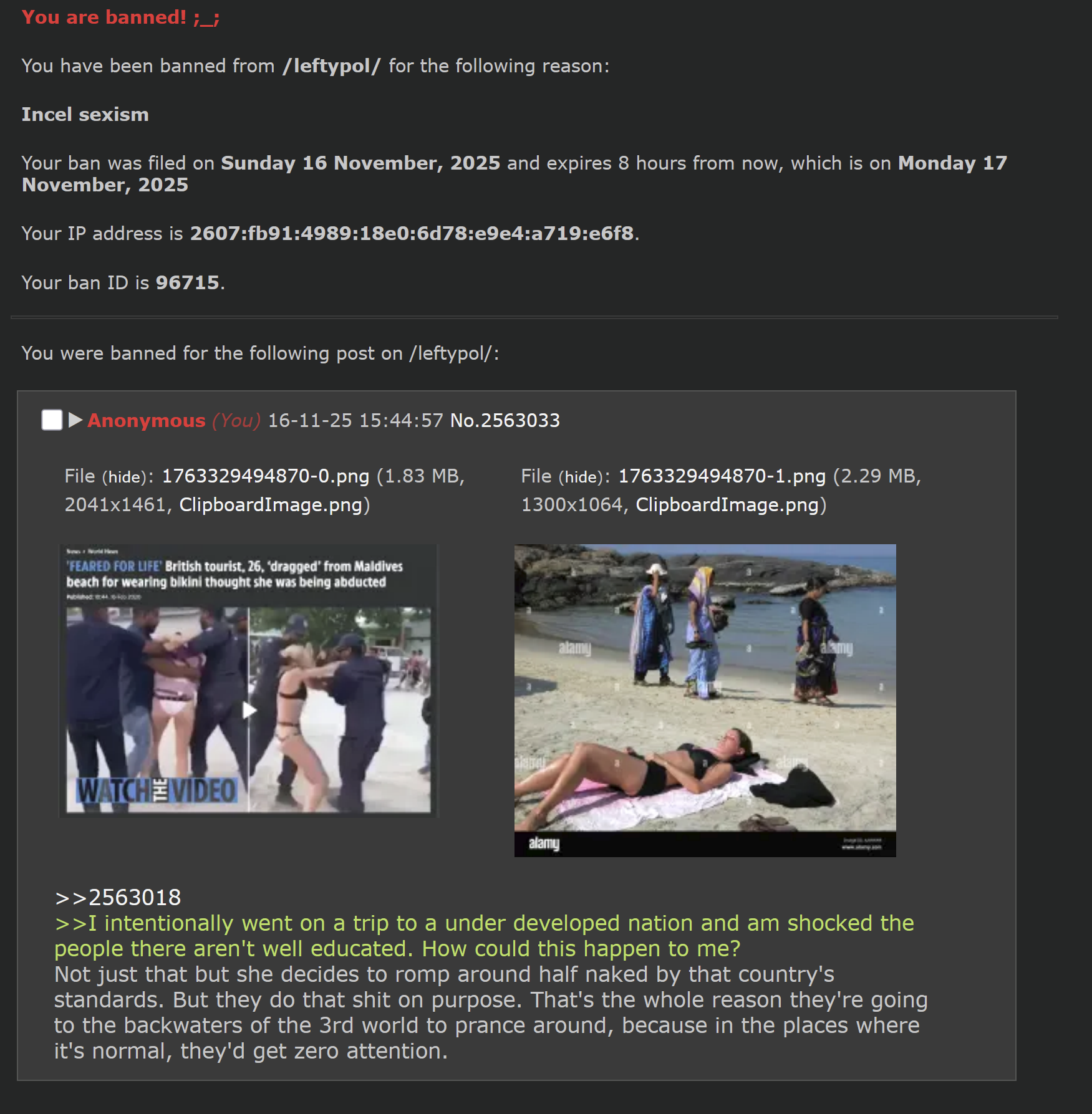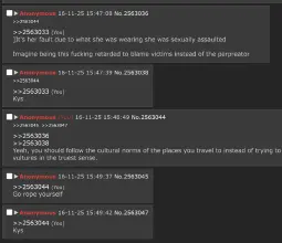 >>43546>you're comparing apples to oranges with the first pic & cases of western women being escorted for breaking local legislation on indecent exposure vs sexual assault and rape I didn't once say I condoned sexual assault in any circumstance. But imagine one of these women walked around completely nude or wearing some fetish gear or whatever is the most provocative in their countries, in some backwater neighborhood. What would be the reaction if they got attacked? It would be "uhhh, what the fuck were they thinking?" Also "that's indecent." So these stupid streamers and vloggers try to go all over the world to places where people make less in their lifetime than they do in a year and act like it's supposed to be the cultural equivalent of their home country. But that's exactly why they make these fucking videos. The women are far from the only ones and the innapropriate attire is far from the only issue. I've mostly seen the men trying to make a big deal about the attention they receive and the hostility that people have for filming them without their permission.
