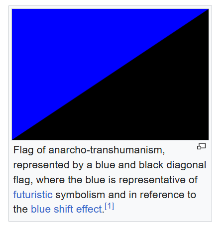 Its not just the flag of transhumanism, its the flag of anarchist-transhumanism - bisected blue and black. Transhumanism on its own generally does not have a flag but mostly commonly is just represented by the h+ symbol. All the other anarchist ideologies have Anarcho- before them, fix the flag name please.